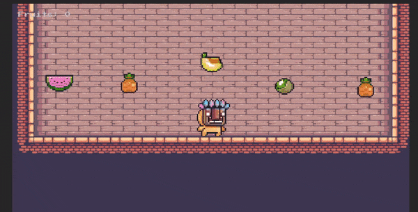 Players can collect items to progress to the next level. These items are fruits which are scattered around the map. When Player touches an item it will disappear and the Fruit counter number will go up by 1.